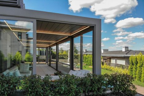 La pergola bioclimatique rétractable devient étanche dès qu’il pleut. L’eau ne s’accumule jamais et s’écoule grâce à son inclinaison.